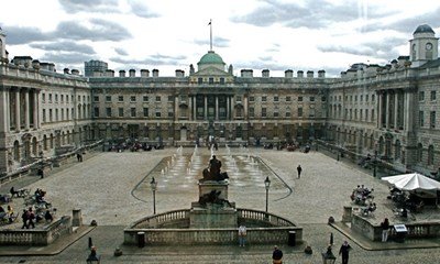 Somerset House is a large building situated on the south side of the Strand in central London, England, overlooking the River Thames, just east of Waterloo Bridge. The central block of the Neoclassical building, the outstanding project of the architect Sir William Chambers, dates from 1776–96. It was extended by classical Victorian wings to north and south. A building of the same name was first built on the site more than two centuries earlier.
